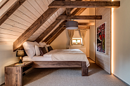 Уютная спальня на даче с деревянной мебелью и мягким освещением