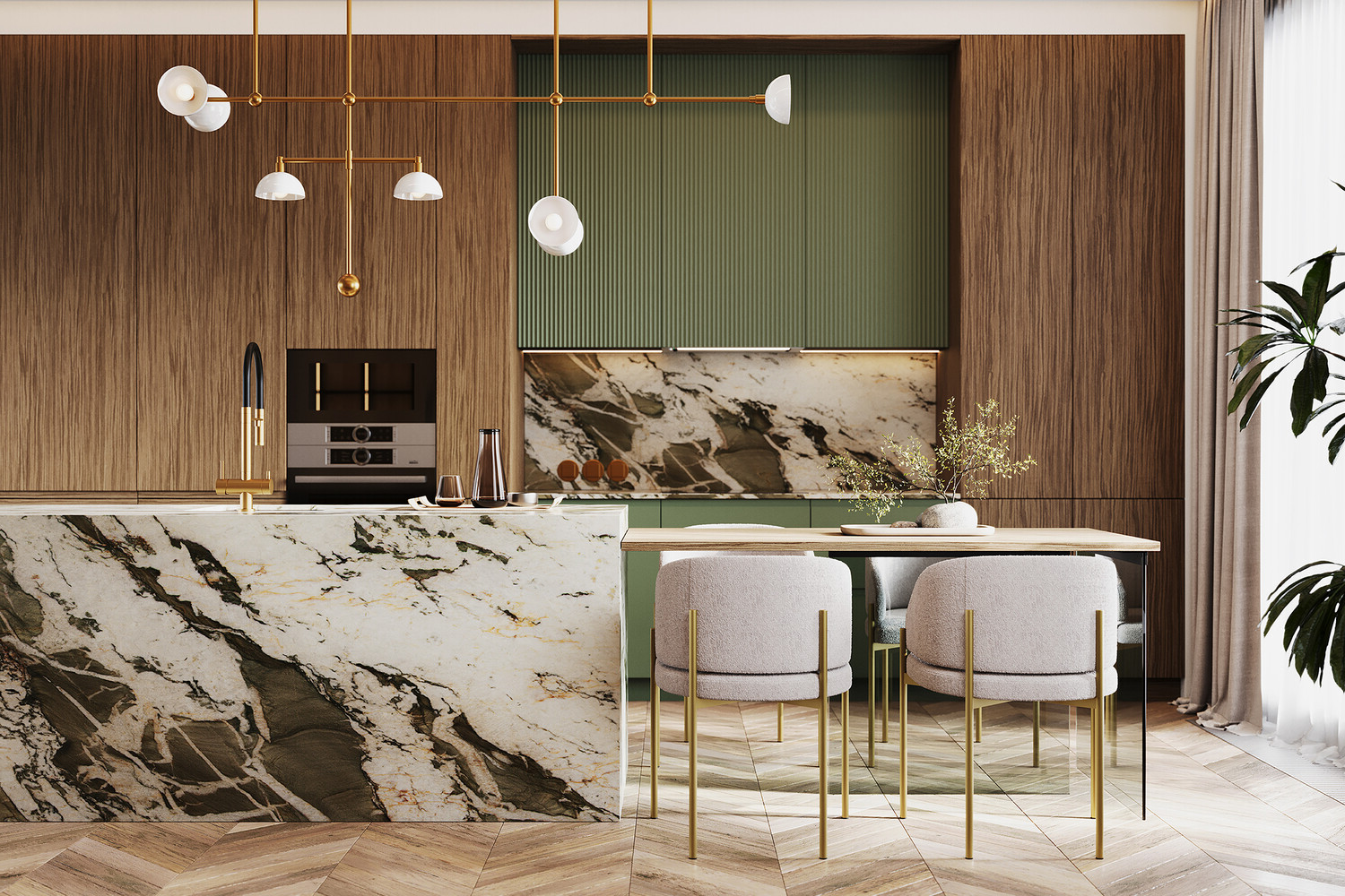 Используйте Calacatta или Denali для рабочей поверхности – они визуально «разогревают» интерьер и гармонируют с деревянными фасадами.