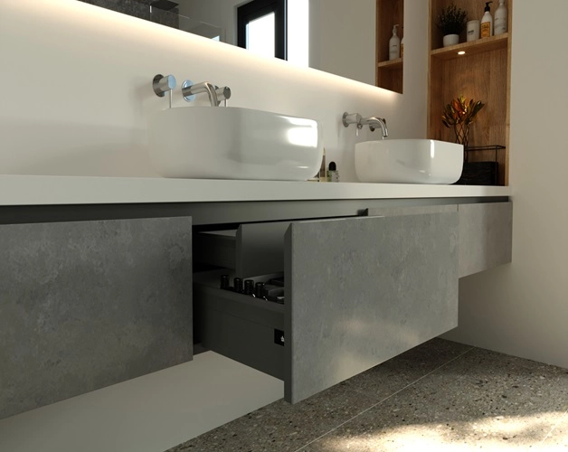 Vicostone Beton BQ-5260: кварцевый агломерат в стиле урбанистического индустриального дизайна, вдохновленный текстурой бетона. Оригинальный Vicostone Ultrathin Beton с темно-серым фоном и яркими прожилками. Подчеркните современность интерьера с Vicostone!